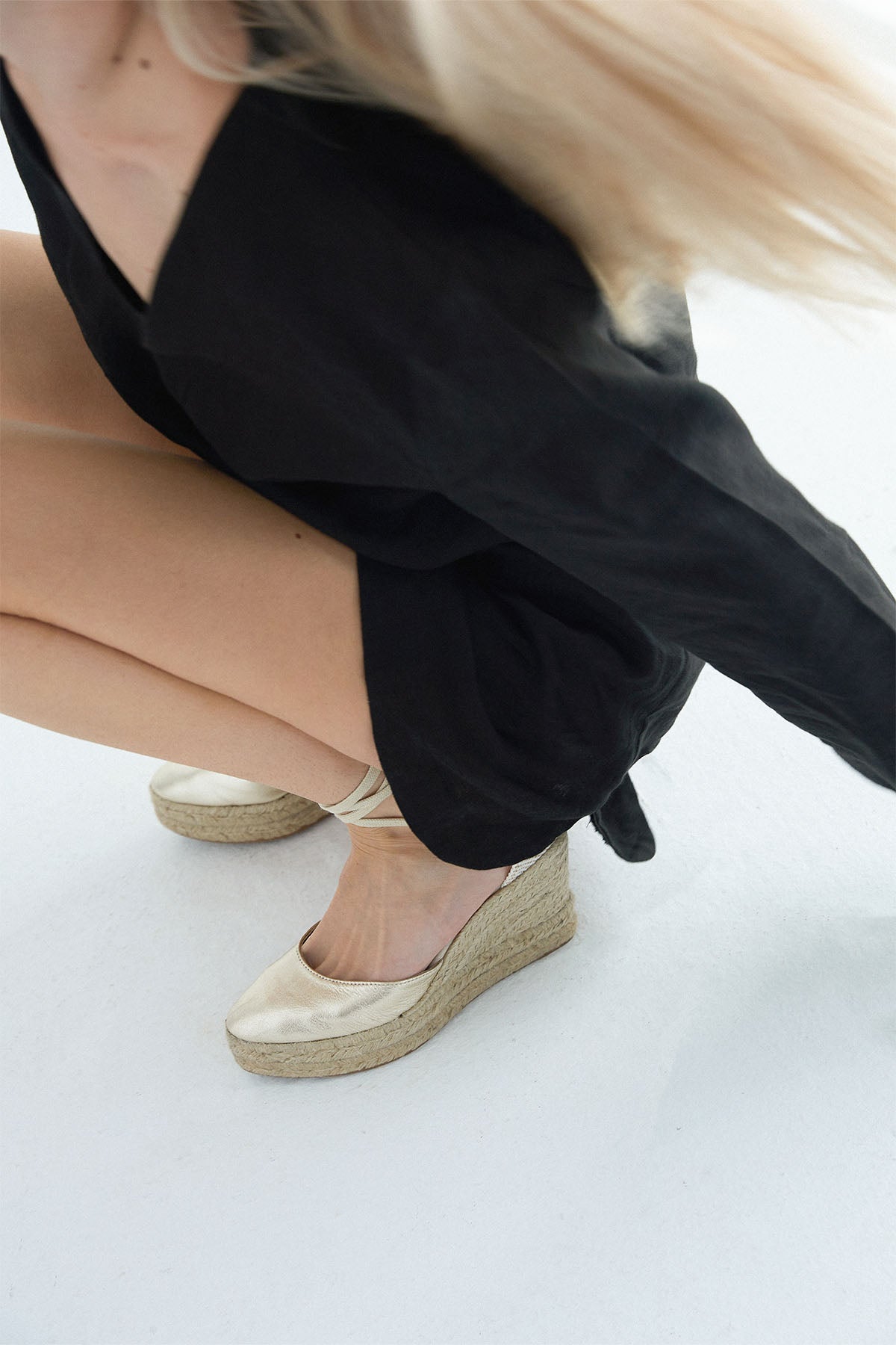 Diseño mediterráneo, producción artesanal y materiales cuidadosamente seleccionados se unen para dar lugar a las cuñas Sardinia Low, anteriomente llamadas Chia. Son un básico renovado: muy escotadas para estilizar tu pie, punta ligeramente redondeada y tiras que abrazan la pierna para asegurar la sujeción. La altura de la cuña es de 7 cm aproximadamente (incluyendo su plataforma de yute trenzado de 2 cm) y suela de goma.