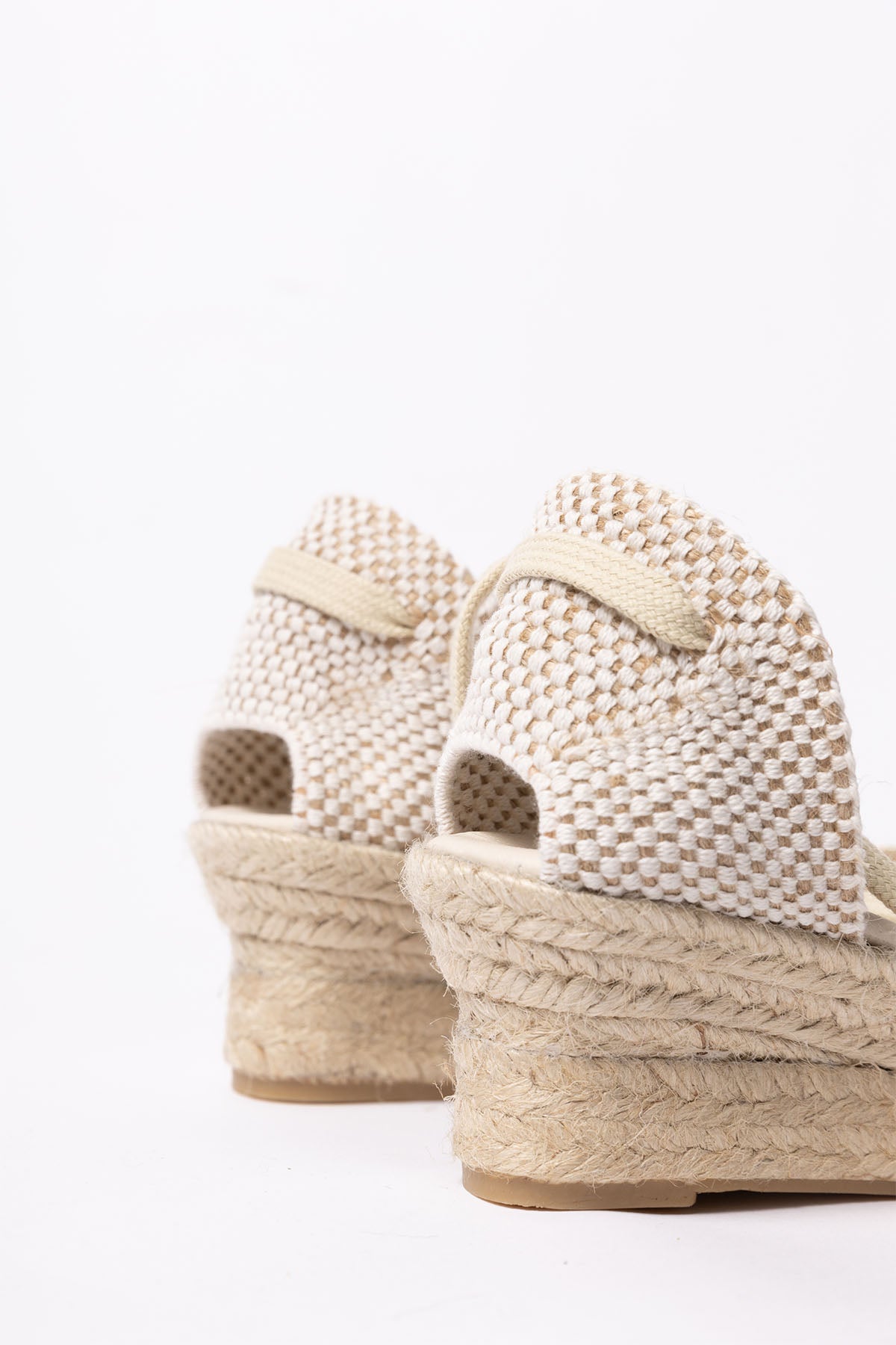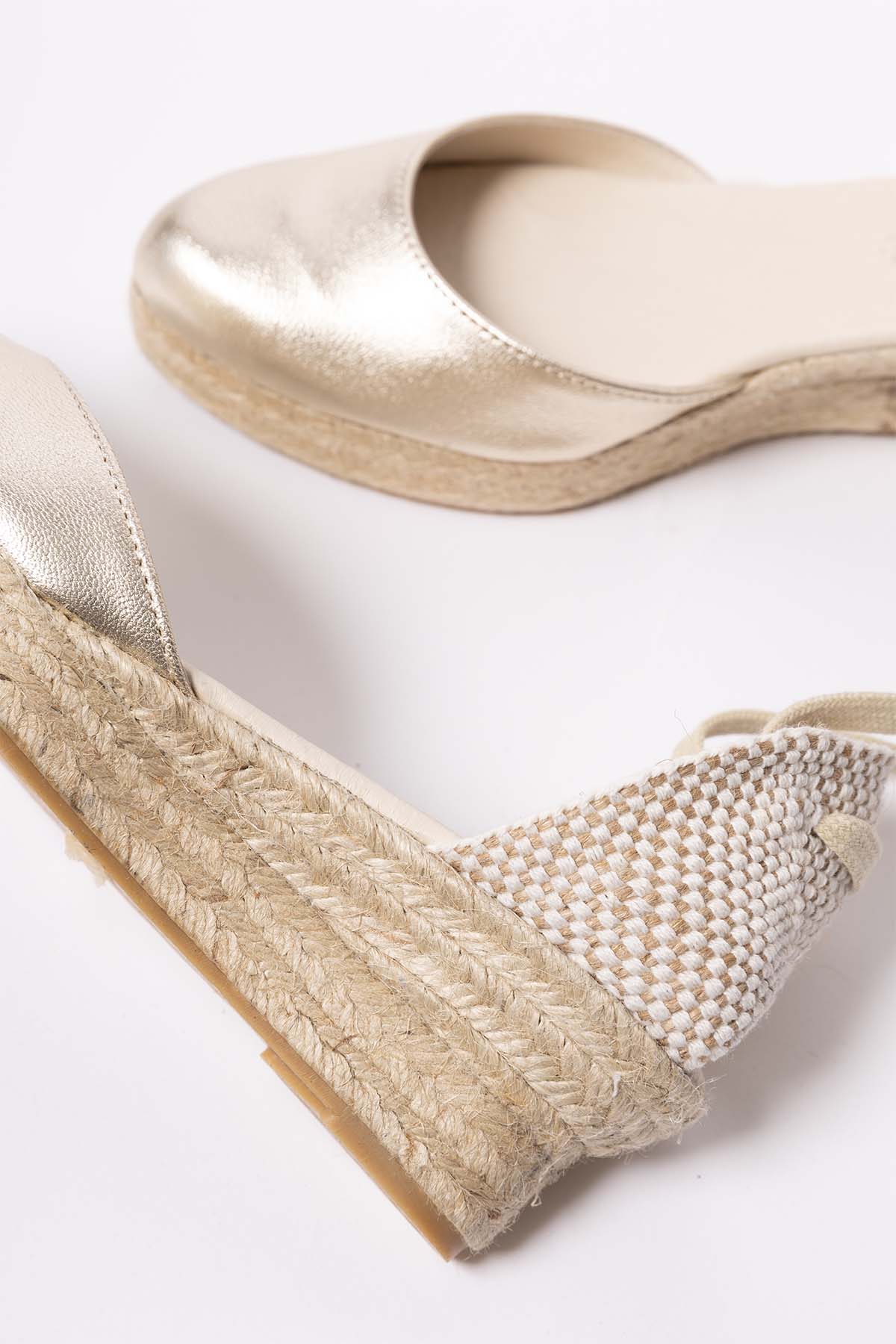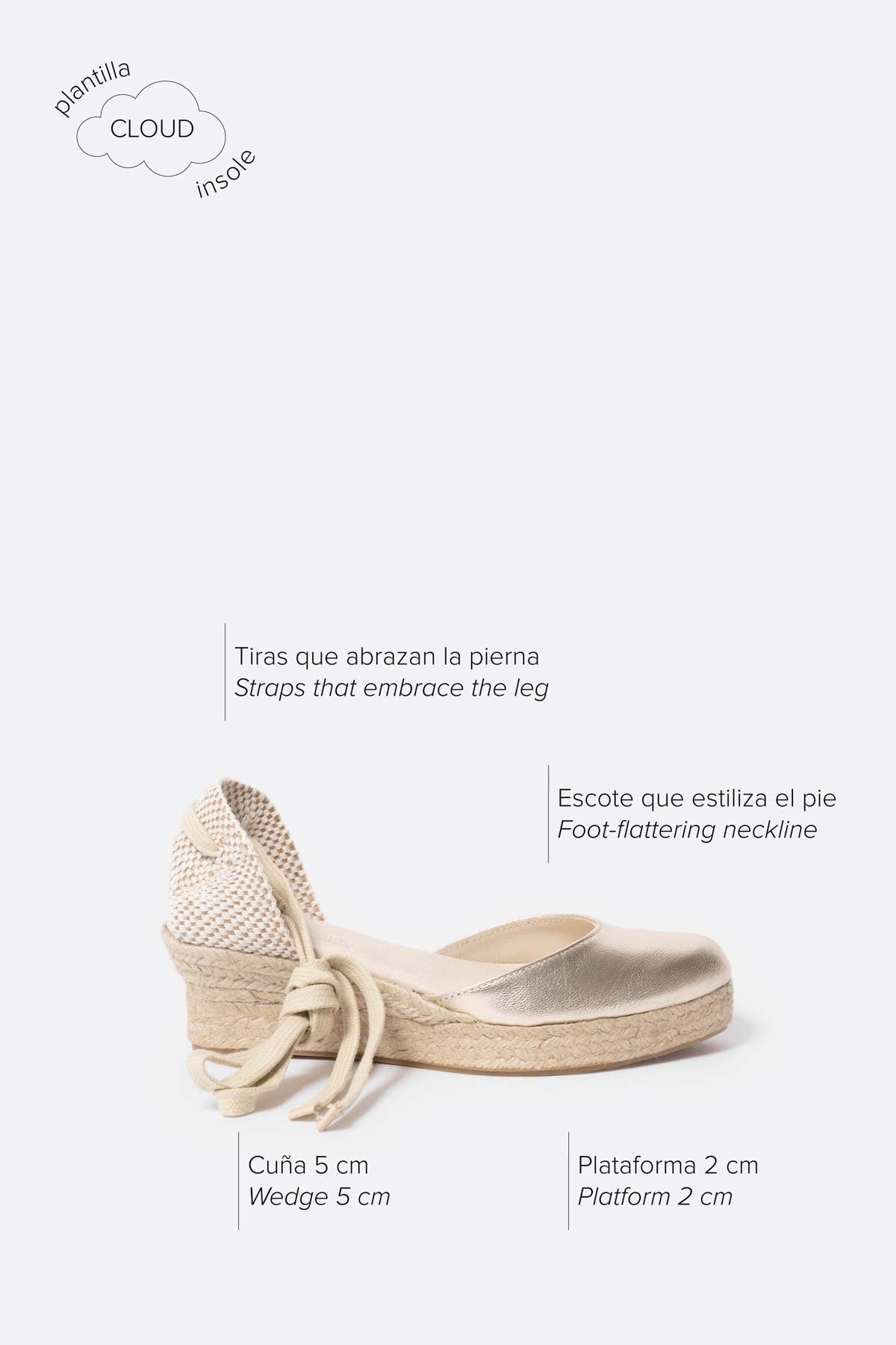 La altura de la cuña es de 5 cm aproximadamente (incluyendo su plataforma de yute trenzado de 2 cm) y suela de goma.