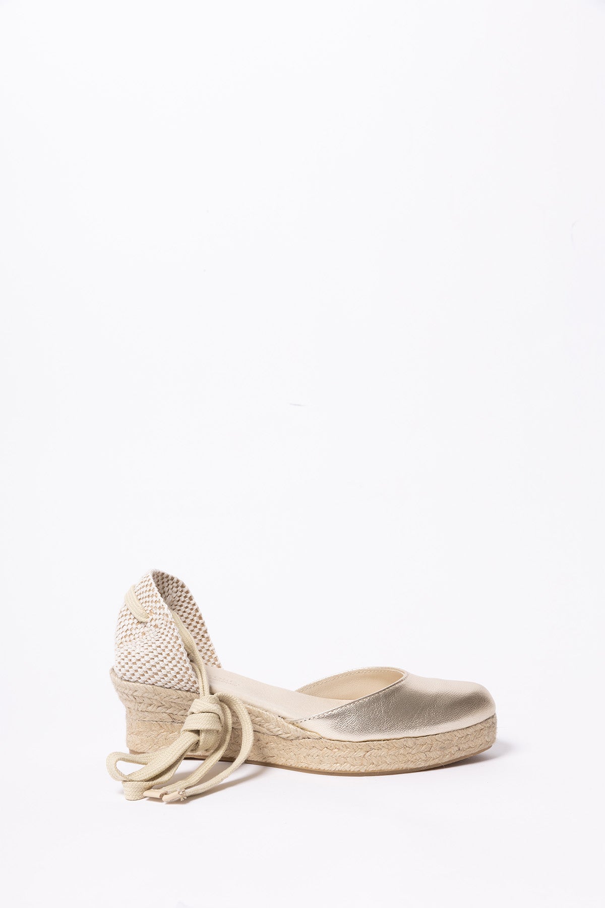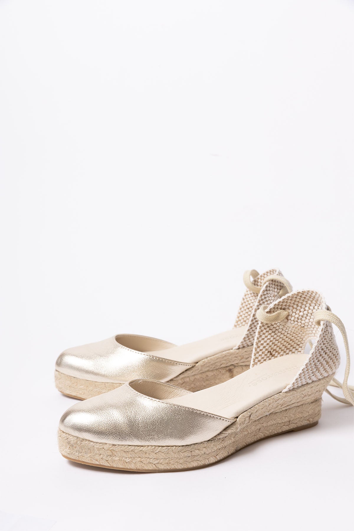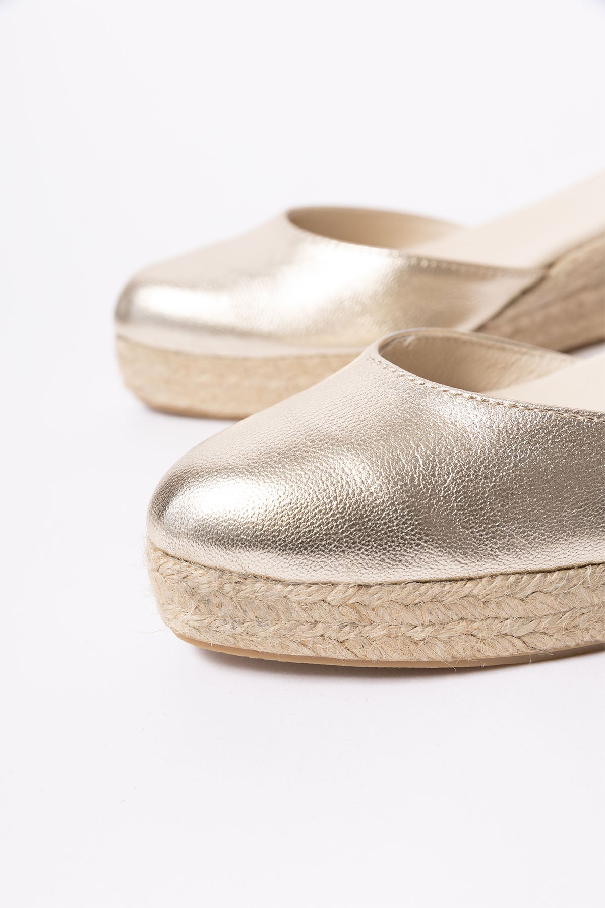 La altura de la cuña es de 5 cm aproximadamente (incluyendo su plataforma de yute trenzado de 2 cm) y suela de goma.